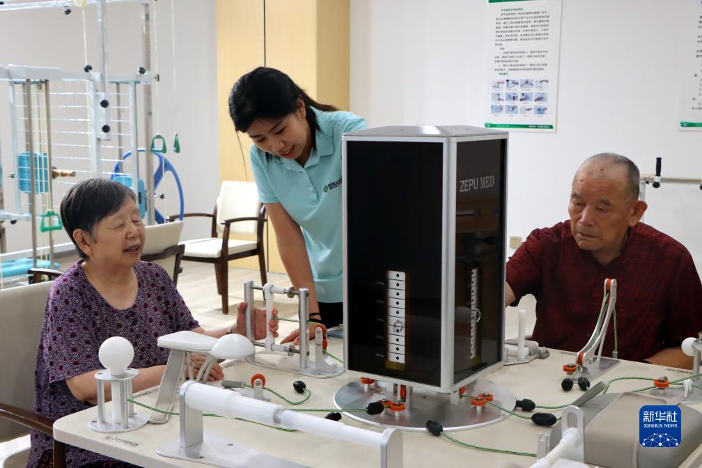 8月21日,老人在位于山東省濱州市沾化區(qū)大高鎮(zhèn)國(guó)昌怡心園內(nèi)的康復(fù)小屋做上肢康復(fù)訓(xùn)練。