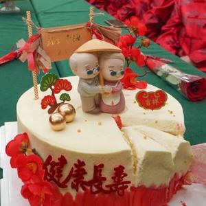 8月22日,在浙江省瑞安市湖嶺鎮綜合文化站,工作人員為金婚夫婦送上蛋糕。