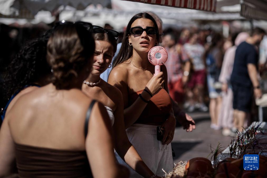 8月22日,在法國南部城市尼斯街頭,一名女子用小風(fēng)扇降溫。
