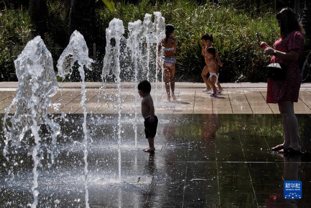 8月22日,人們在法國南部城市尼斯的一處噴泉消暑降溫。