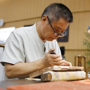 8月22日,在揚(yáng)州市圖書館,江蘇省雕版工藝美術(shù)大師沈樹華在“古籍里的揚(yáng)州運(yùn)河文化”市集上為市民展示雕刻技藝。