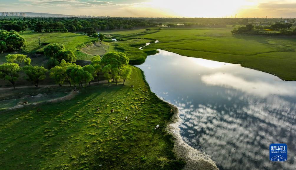 晚霞照耀在白云倒影的蘆河河面(8月18日攝,無人機照片)。