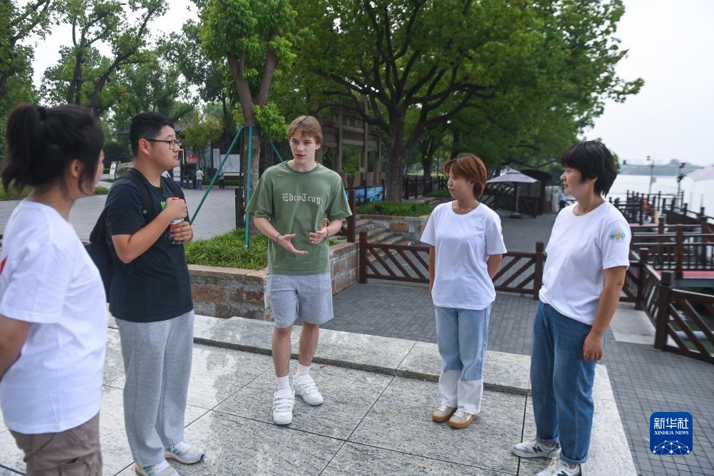 8月23日,在嘉興南湖邊,一名外教(左三)帶著參加培訓的導游們模擬外國游客游覽過程中各種場景。