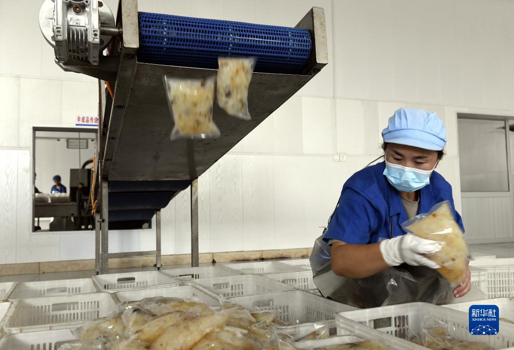 8月22日,在山東省濱州市沾化區馮家鎮隆旺水產的加工車間內,工人在裝箱即食海蜇。