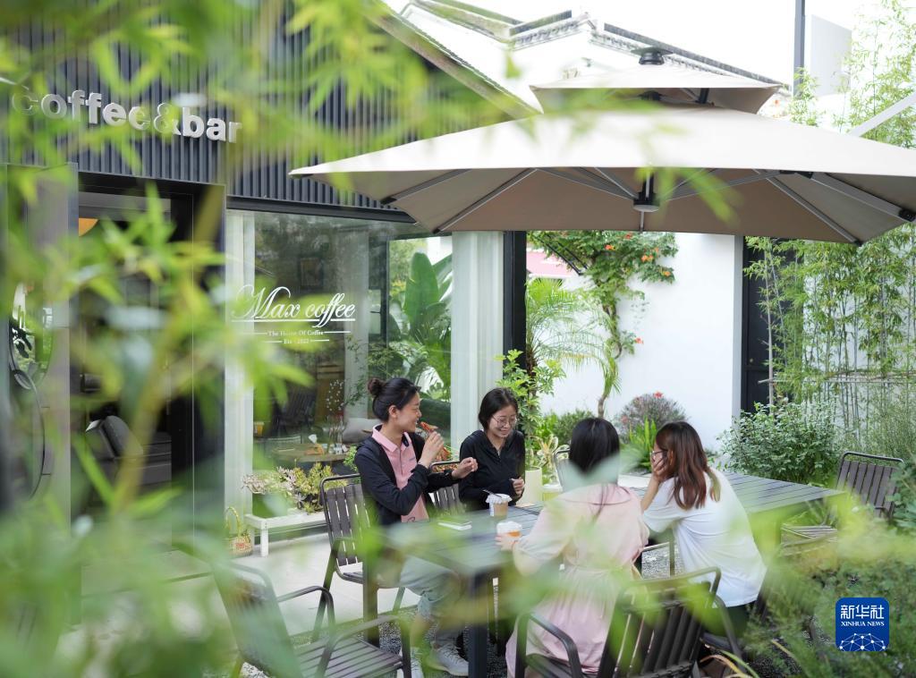 8月23日,在八里店鎮(zhèn)潞村,游客在一家咖啡館休憩。