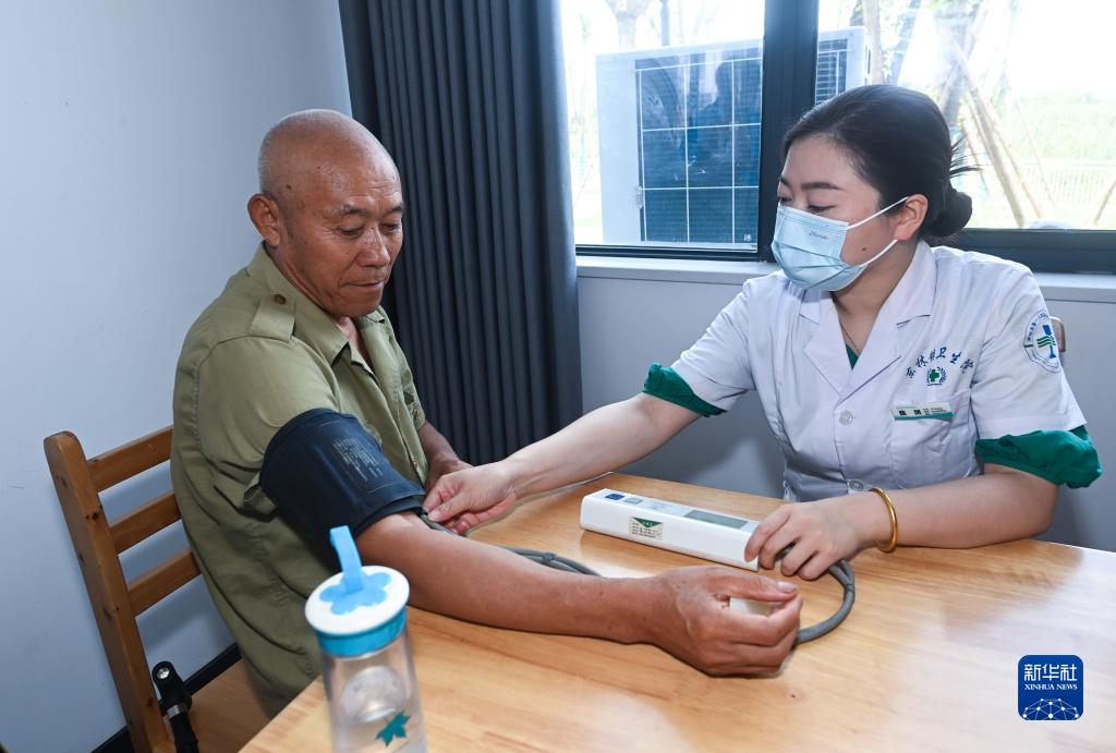 8月23日,在湖州市吳興區(qū)東林鎮(zhèn)東華村文化禮堂,東林鎮(zhèn)衛(wèi)生院黨員志愿者給老人測(cè)量血壓。