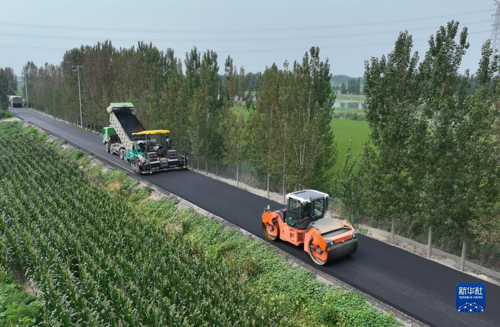 8月23日,工人在唐山市豐南區陡河沿岸鄉村公路建設工地施工(無人機照片)。