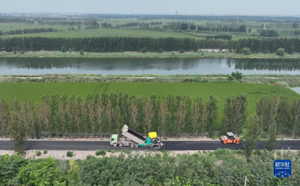 8月23日,工人在唐山市豐南區(qū)陡河沿岸鄉(xiāng)村公路建設(shè)工地施工(無人機(jī)照片)。