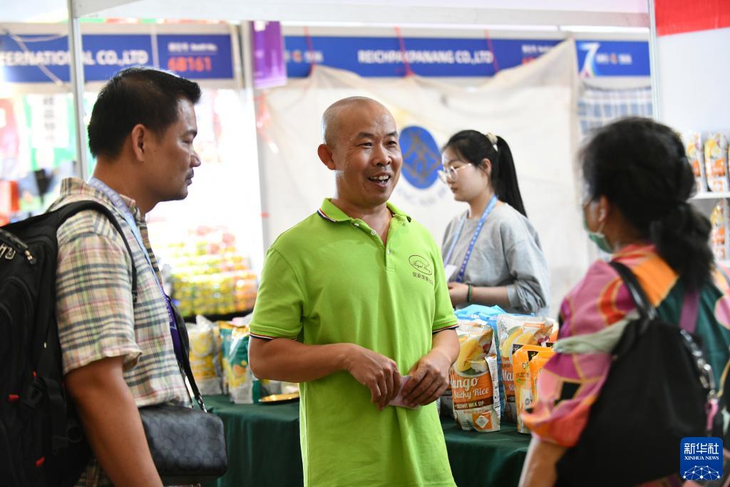 陳杰(中)在南博會現場和別的展商交流(8月18日攝)。新華社記者 陳欣波 攝