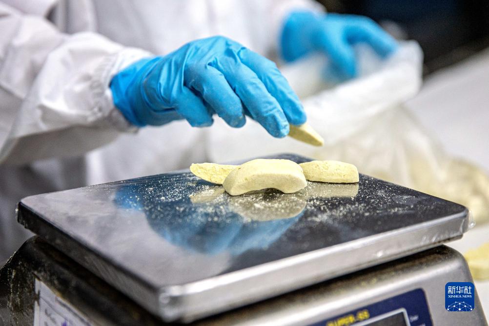 8月17日,在泰國尖竹汶府,尖竹汶果品公司工作人員稱重榴蓮干。新華社記者 王騰 攝