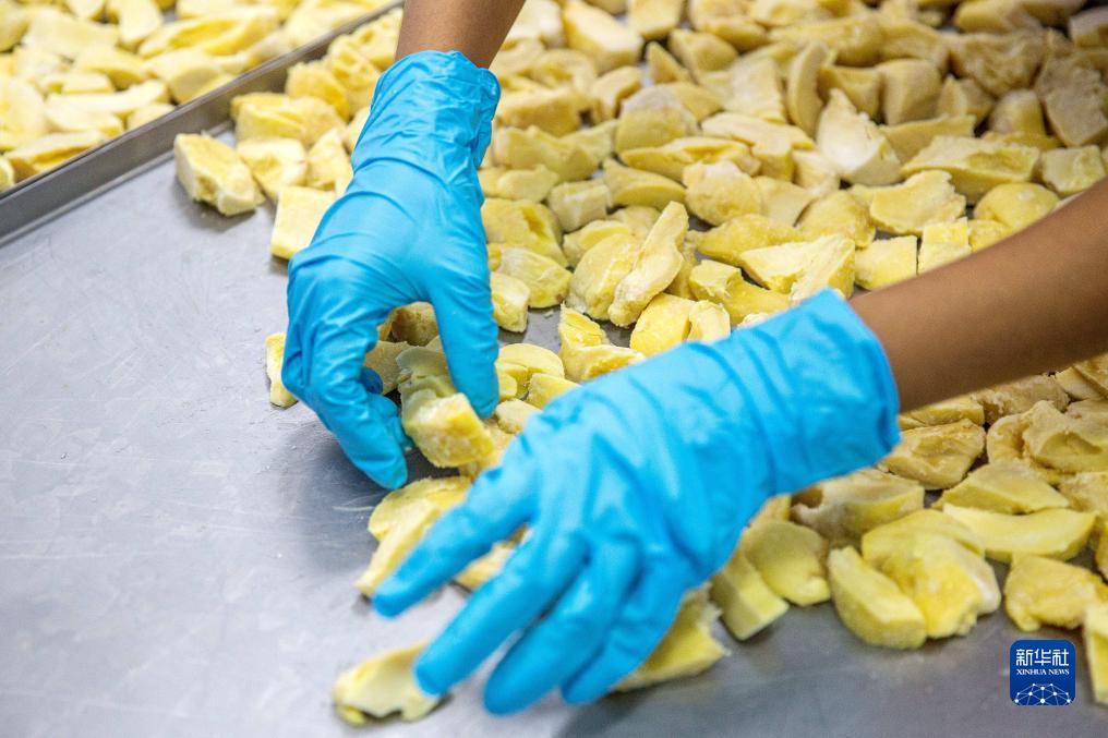 8月17日,在泰國尖竹汶府,尖竹汶果品公司工作人員碼放榴蓮果肉。新華社記者 王騰 攝