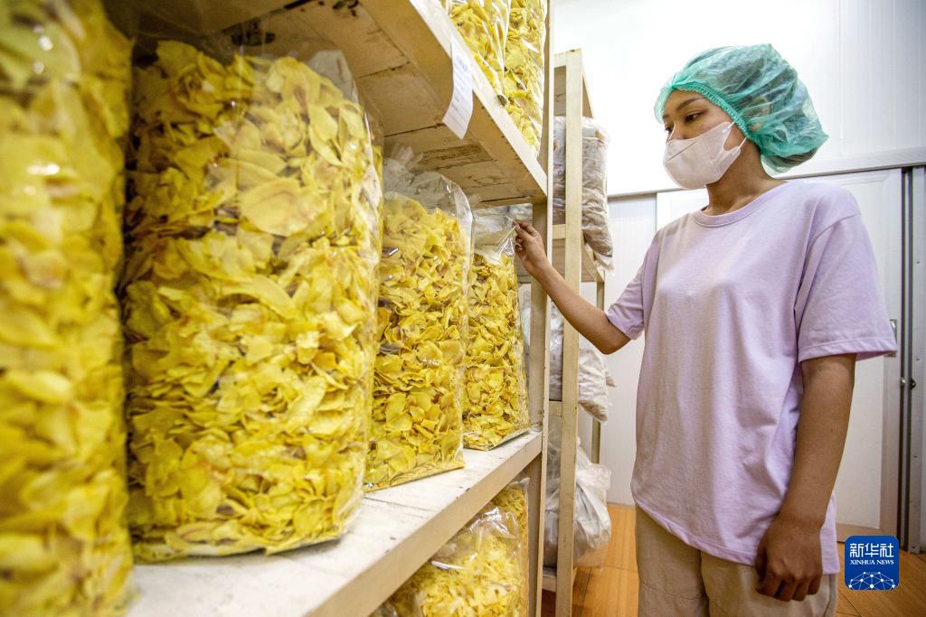 8月17日,在泰國尖竹汶府,尖竹汶果品公司工作人員檢查榴蓮干。新華社記者 王騰 攝