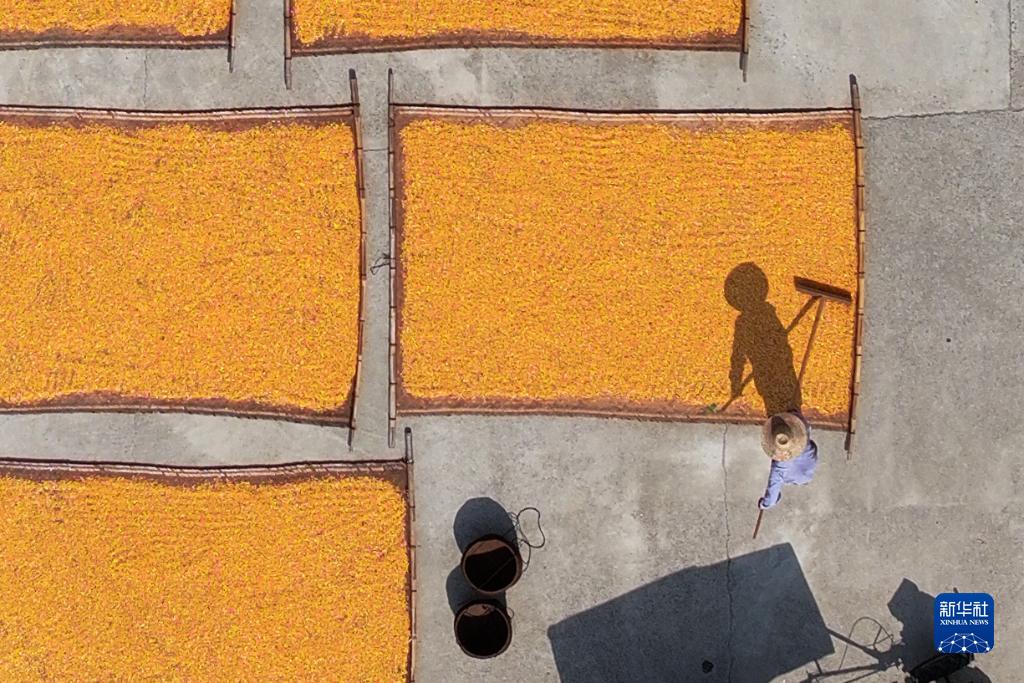 8月23日,貴州省黔東南苗族侗族自治州岑鞏縣注溪鎮(zhèn)衙院村村民在晾曬玉米(無(wú)人機(jī)照片)。