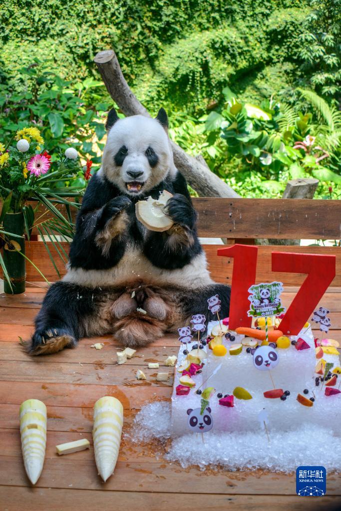 在馬來西亞國家動物園大熊貓保護中心內,中國旅馬大熊貓夫婦“興興”和“靚靚”23日迎來了17歲生日。
