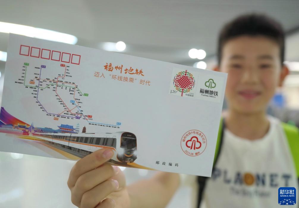 8月23日,一名小朋友在福州地鐵東街口站內展示福州地鐵4號線通車紀念首日封。