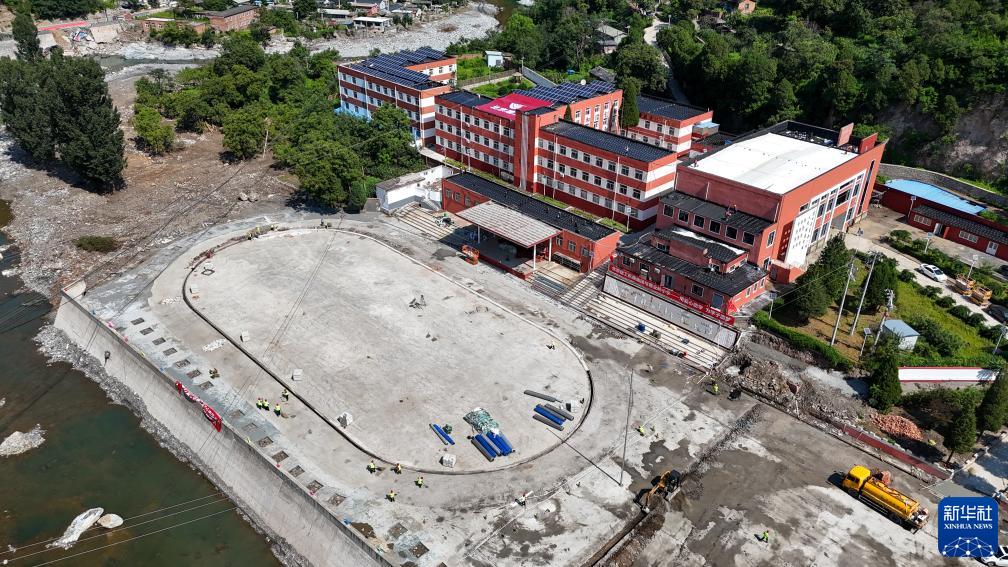 8月23日,在北京市房山區霞云嶺中心小學,北京建工機施集團的施工人員在進行操場施工(無人機照片)。