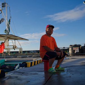 8月23日,打漁歸來的小野春雄坐在日本福島縣新地町的漁港。