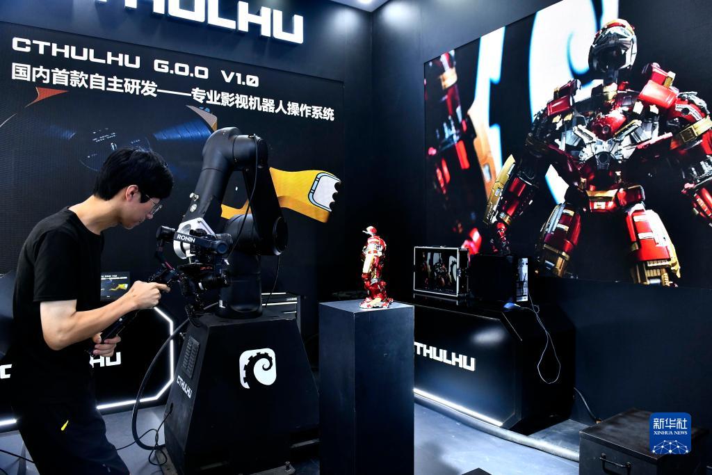 8月24日,在青島召開的2023年中國網絡視聽精品創作峰會上,智能視聽沉浸式體驗展區在展示專業影視機器人。