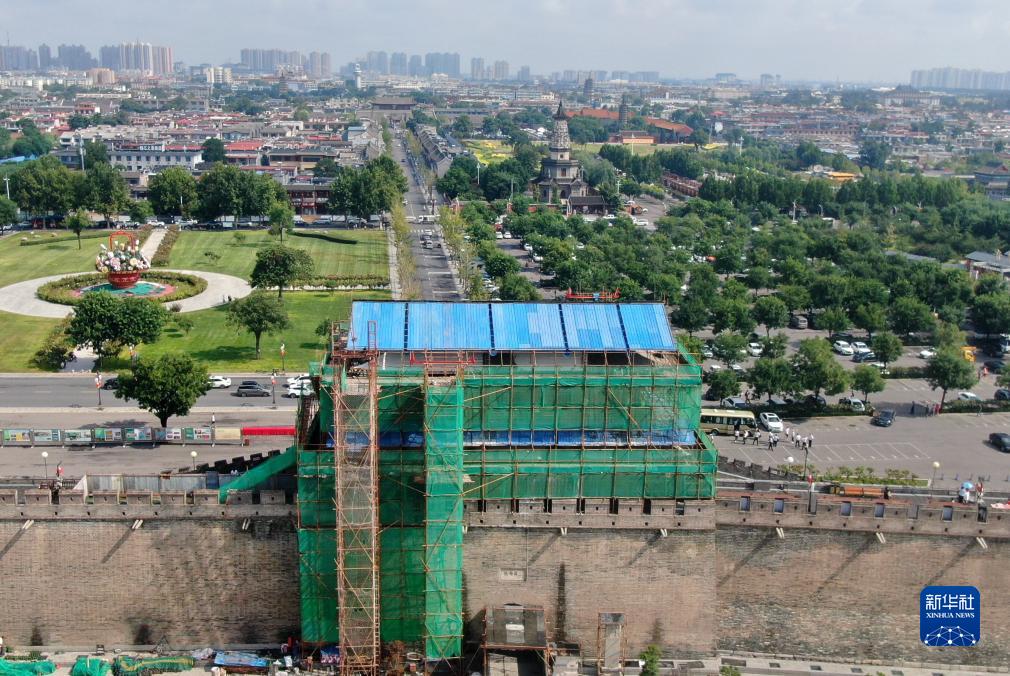 這是8月24日拍攝的正在修繕中的河北正定古城南城門樓(無人機照片)。