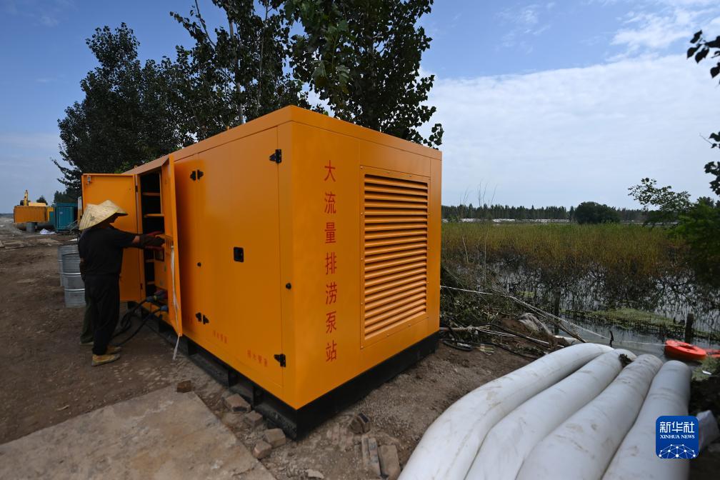 8月24日,工作人員在天津市靜海區(qū)大清河南堤抽水現(xiàn)場(chǎng)檢查抽水泵工作狀態(tài)。