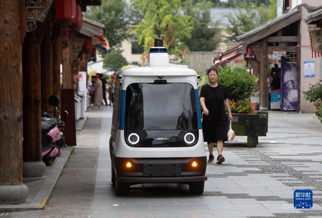 8月24日,在浙江省磐安縣尖山鎮(zhèn)烏石村,無(wú)人快遞車穿梭在山村街巷。