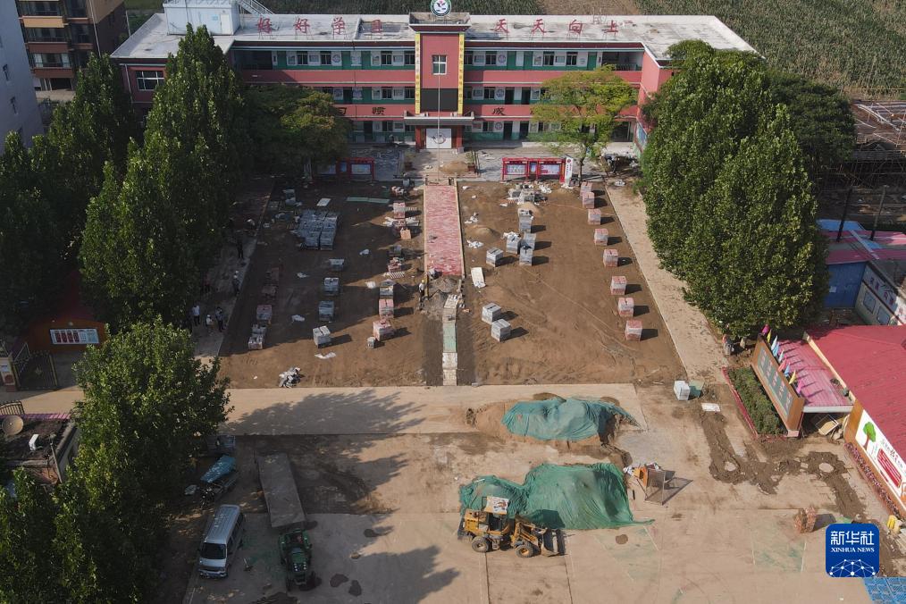 8月24日,施工人員在河北省邢臺(tái)市寧晉縣大曹莊鎮(zhèn)中心小學(xué)修繕學(xué)校路面(無(wú)人機(jī)照片)。