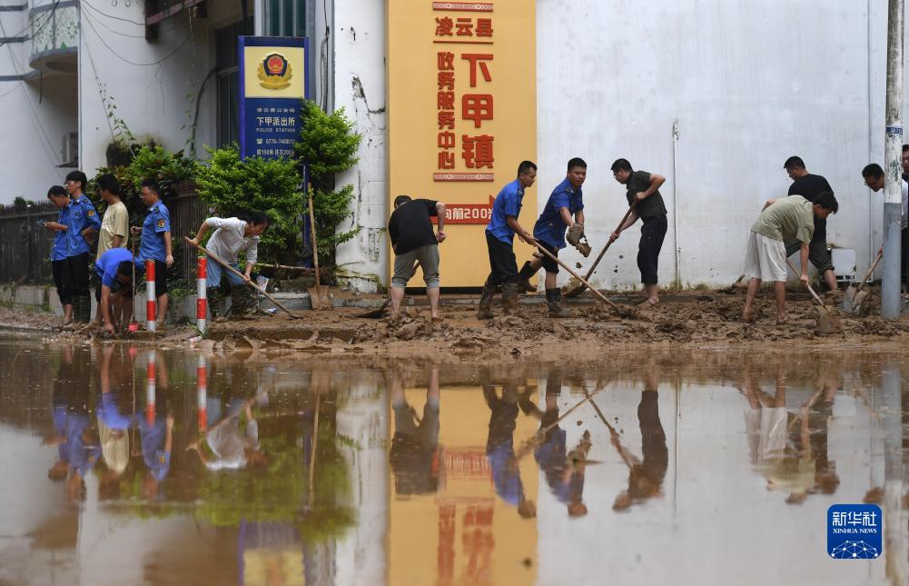 8月24日,在廣西百色市凌云縣下甲鎮,人們在清理道路上的淤泥。