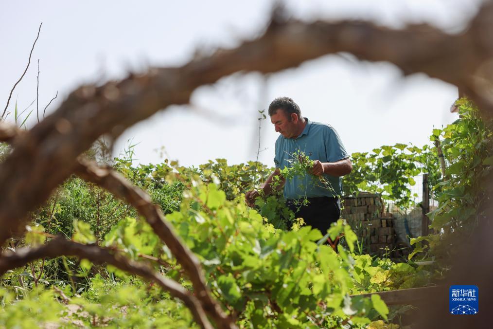 8月18日,爾肯·熱衣木在自家棉田的小院中清理葡萄架旁的雜草。這些葡萄架是今年新栽的,為把院子改造成農家樂做準備。