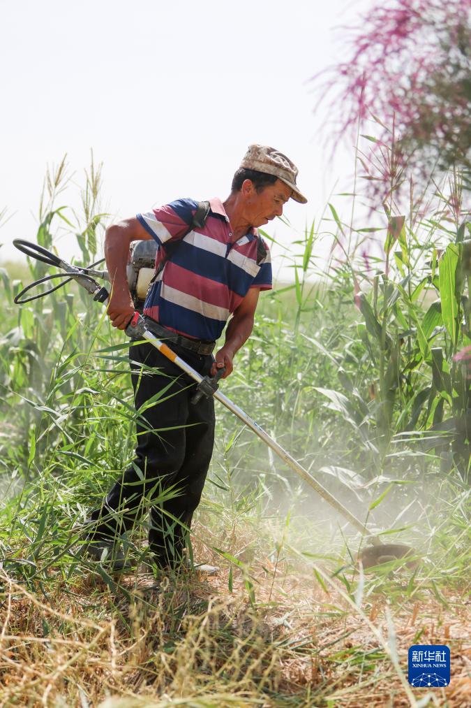 8月17日,工人在棉田田埂上除草。