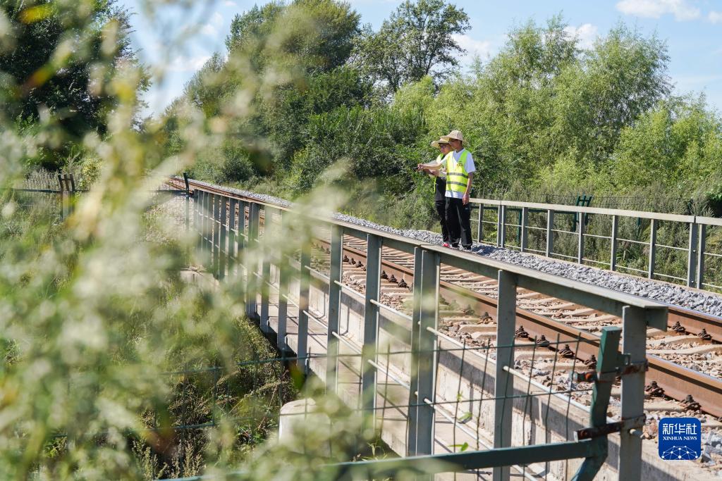 在黑龍江省雙鴨山市集賢縣的鐵路沿線,勘察班組成員田澤敏(右)與胡道寧在鐵路既有線開展調查作業(8月24日攝)。