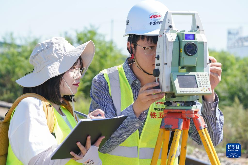 在黑龍江省雙鴨山市集賢縣的鐵路沿線,勘察班組成員王夢迪(左)與王樸生在鐵路既有線開展測量作業(8月24日攝)。