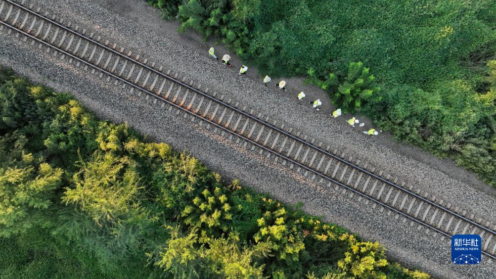 8月24日,在黑龍江省雙鴨山市集賢縣的鐵路沿線,勘察班組成員在鐵路既有線開展調查作業(無人機照片)。