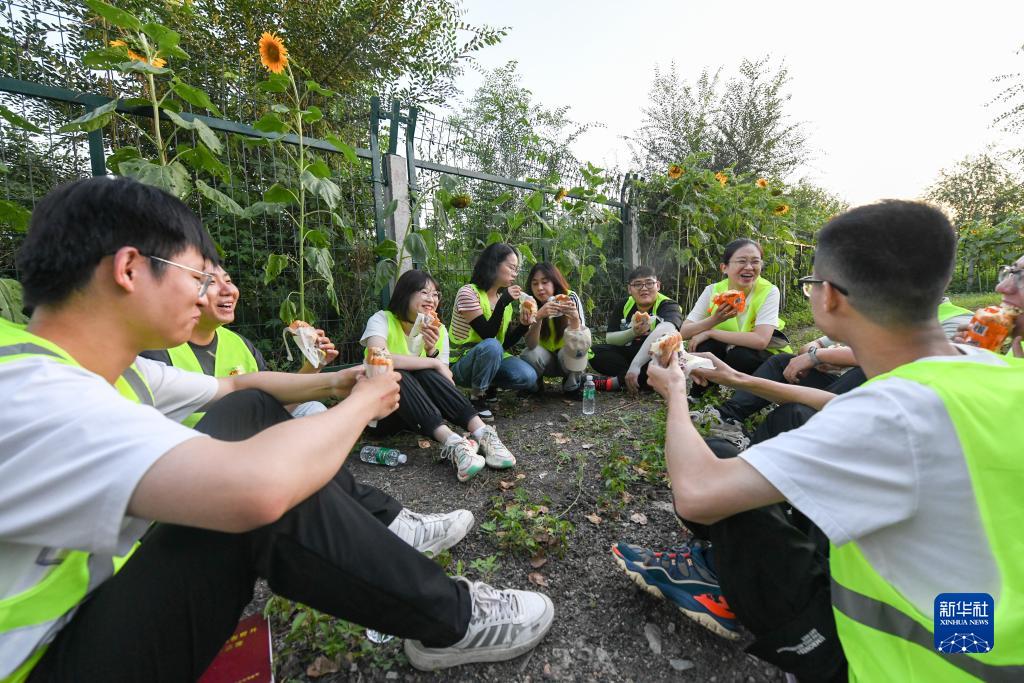 在黑龍江省雙鴨山市集賢縣的鐵路沿線旁一空地,勘察班組成員在工閑時吃飯休息(8月24日攝)。