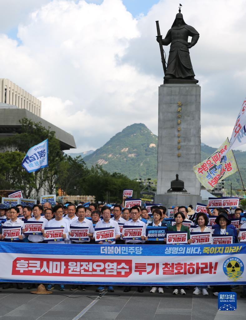 當(dāng)日,韓國(guó)最大在野黨共同民主黨成員和眾多市民聚集在首爾光化門廣場(chǎng),手舉標(biāo)語(yǔ)進(jìn)行示威游行,抗議日本核污染水排海。日本政府24日啟動(dòng)福島核污染水排海,這一決定遭到國(guó)際社會(huì)的批評(píng)和反對(duì)。