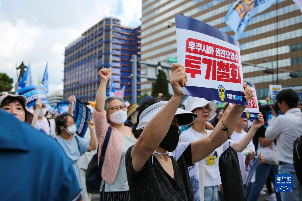 當日,韓國最大在野黨共同民主黨成員和眾多市民聚集在首爾光化門廣場,手舉標語進行示威游行,抗議日本核污染水排海。日本政府24日啟動福島核污染水排海,這一決定遭到國際社會的批評和反對。