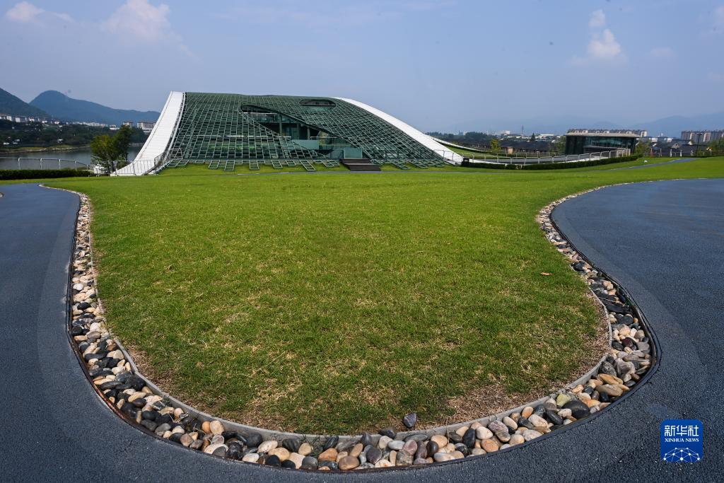 這是8月24日在杭州富陽水上運(yùn)動中心拍攝的屋頂花園的草坪和步行道,雨水通過鵝卵石過濾下滲,循環(huán)利用。新華社記者 徐昱 攝