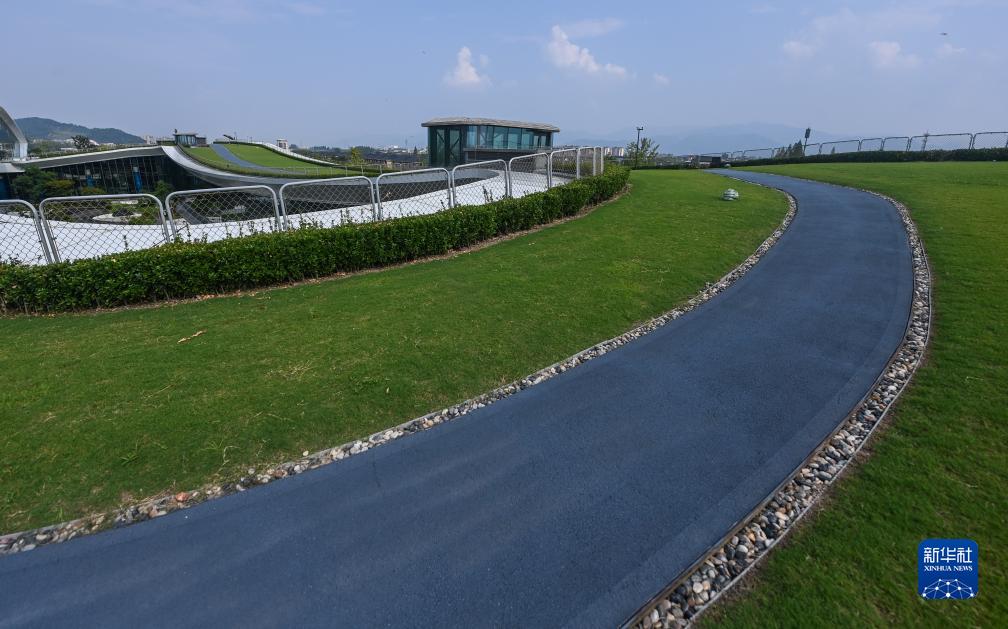 這是8月24日在杭州富陽水上運動中心拍攝的屋頂花園的草坪和步行道,雨水通過鵝卵石過濾下滲,循環(huán)利用。新華社記者 徐昱 攝