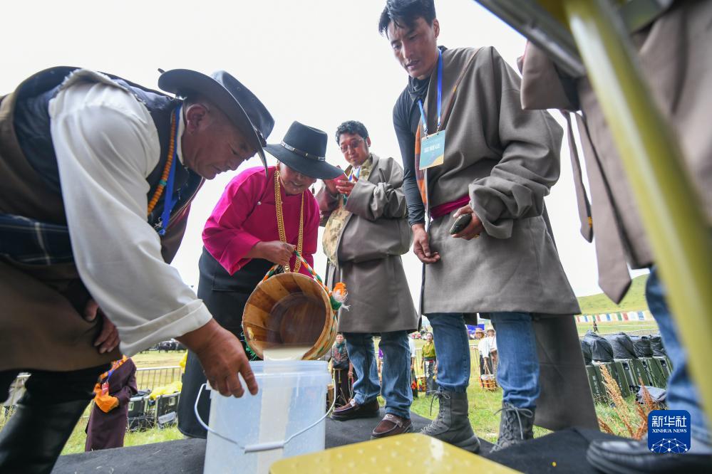 8月25日,在四川省阿壩藏族羌族自治州紅原縣雅克音樂牧場,參賽者在比賽結束后倒出牦牛奶稱重。