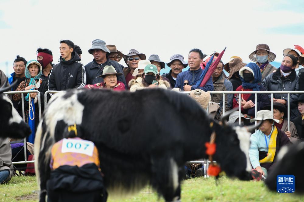 8月25日,在四川省阿壩藏族羌族自治州紅原縣雅克音樂(lè)牧場(chǎng),當(dāng)?shù)厝罕姾陀慰驮谟^看擠牦牛奶比賽。