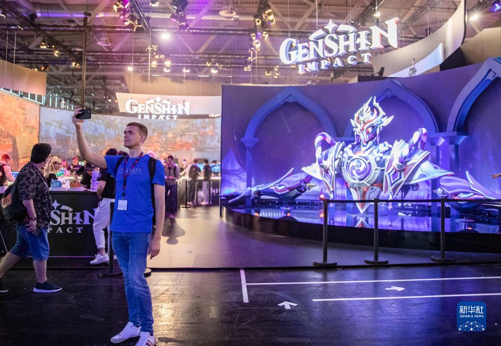 8月23日,在德國(guó)科隆游戲展上,一名參觀者在米哈游展臺(tái)前自拍。