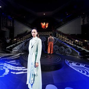 當日,上海博物館攜手杭州良渚遺址管理區管理委員會推出“研色·良渚之夜”沉浸式綜合藝術秀演出。作為“何以中國”系列大展的第二展“實證中國:崧澤·良渚文明考古特展”的活動之一,“研色·良渚之夜”采用現代舞、服裝秀、音樂秀和數字投影燈光秀等多種舞臺藝術形式,結合良渚核心色彩和文化元素,讓觀眾沉浸式體驗良渚穿越五千年的美學文化。新華社記者 任瓏 攝