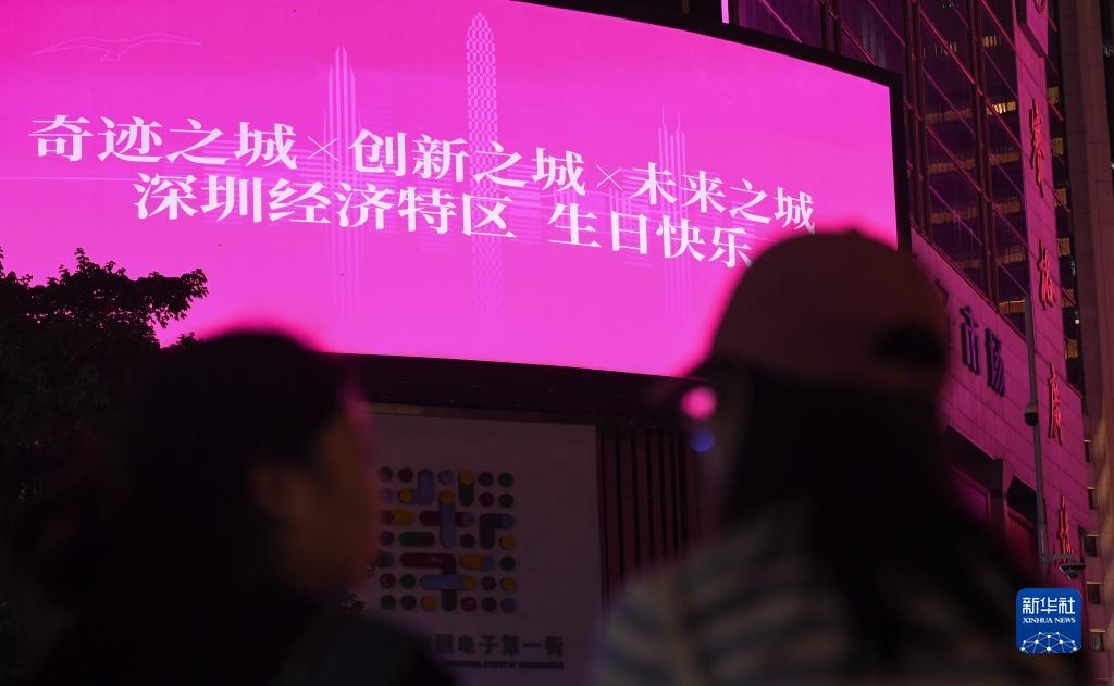 8月25日,兩位市民在深圳華強(qiáng)北觀看為深圳慶生的廣告牌。新華社記者 毛思倩 攝
