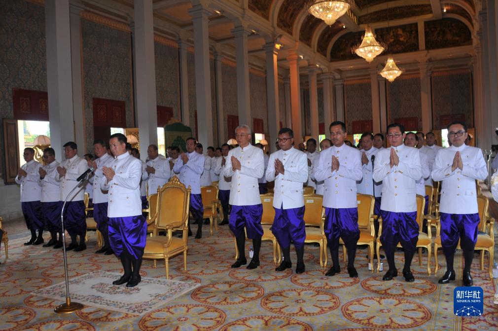 8月22日,柬埔寨首相洪瑪奈(前中)在首都金邊率領新內閣宣誓就職。
