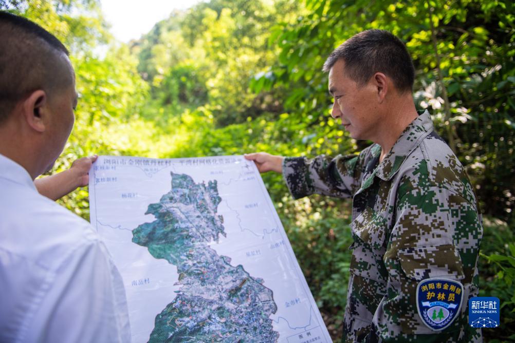 8月24日,在瀏陽市金剛鎮平灣村,黃蔚谷(右)和村級林長對照地圖確定古樹位置。