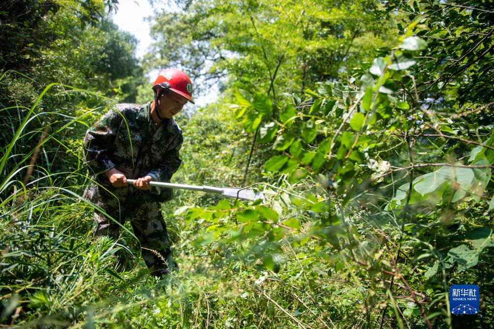 8月24日,在瀏陽市金剛鎮平灣村,黃蔚谷清理巡山路上的雜草。