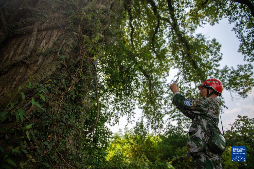 8月24日,在瀏陽市金剛鎮丹桂村,黃蔚谷記錄古樹生長情況。