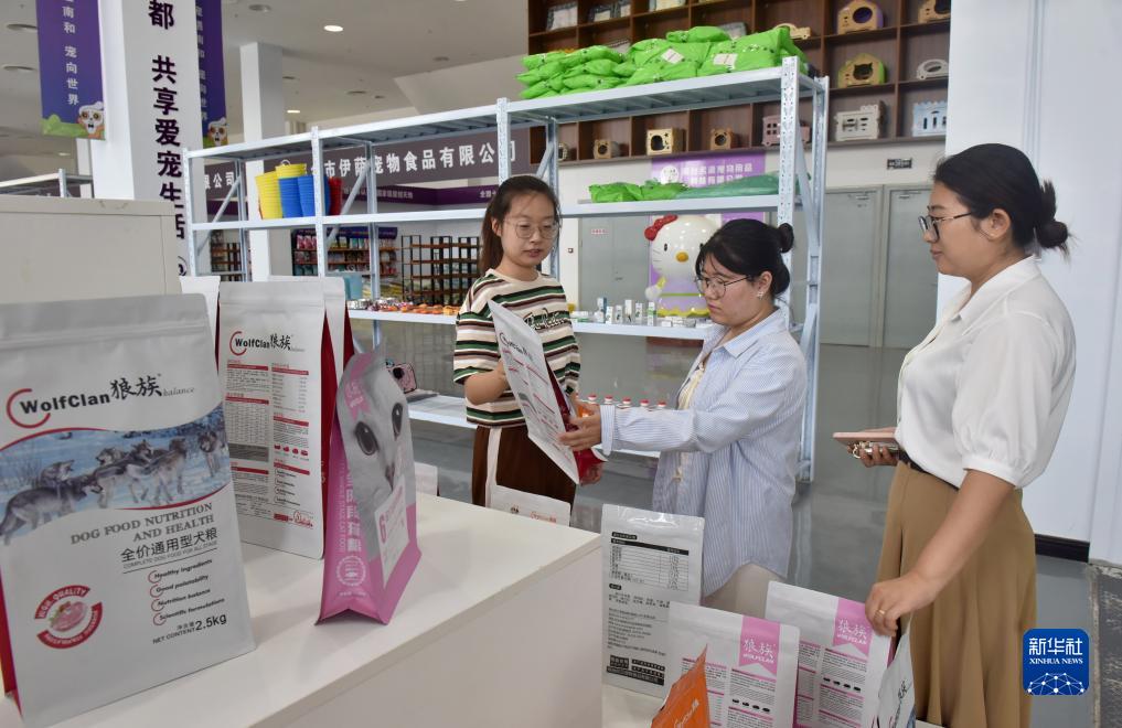 8月30日,顧客在河北省邢臺市南和區(qū)賈宋鎮(zhèn)一家寵物用品生產(chǎn)企業(yè)電商展廳了解產(chǎn)品信息。