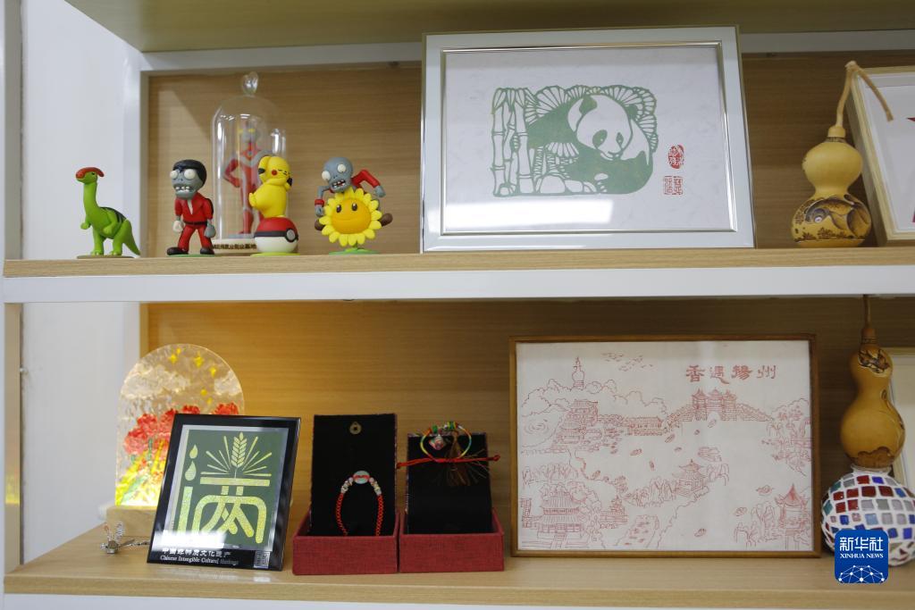 這是8月30日在江蘇揚州小滿助殘就業創業基地拍攝的手工藝品展示柜。