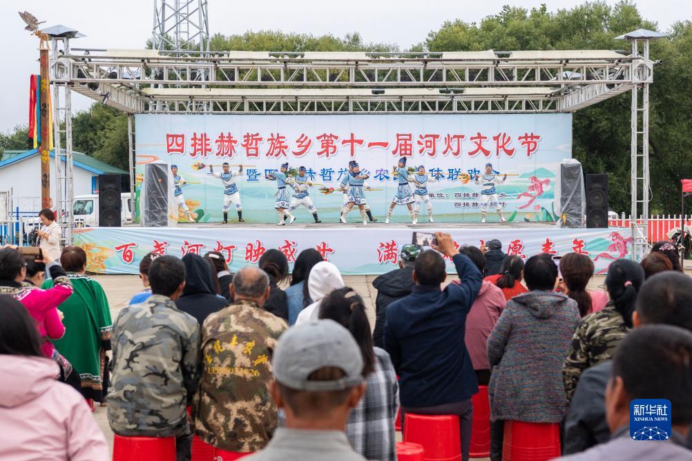 8月30日,在黑龍江省饒河縣四排赫哲族鄉,當地居民觀看河燈文化節的表演。