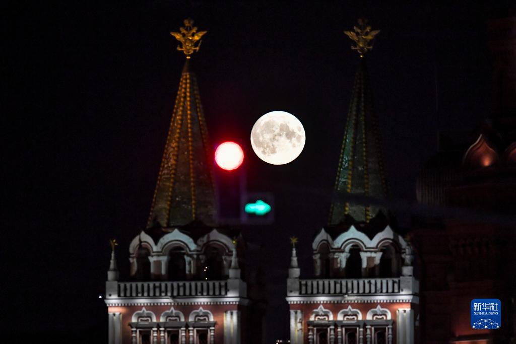 這是8月30日在俄羅斯首都莫斯科紅場附近拍攝的“超級月亮”。